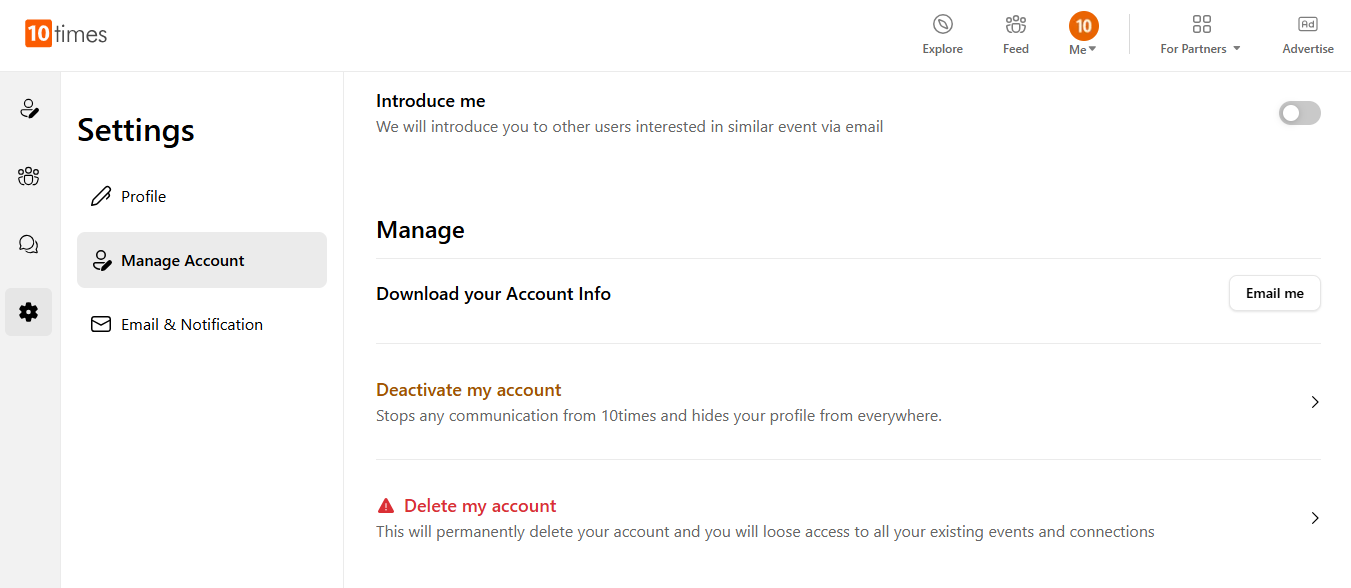 This option permanently removes your account from 10times.