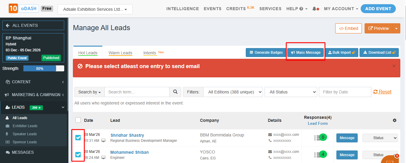 The users who have filled in complete profile details while registering for the event, only they will show under visitors list above. Mass message can be sent only to them.